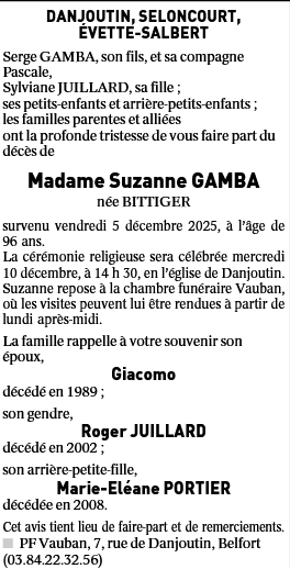 C’est avec une grande tristesse que nous vous annonçons le décès de Suzanne GAMBA survenu le vendredi 05 décembre 2025 à Audincourt. La cérémonie se déroulera le mercredi 10 décembre 2025 à 14h30 à l’adresse suivante : Eglise Saint-Just - 44 Rue du Dr Eugène Jacquot - 90400 Danjoutin.